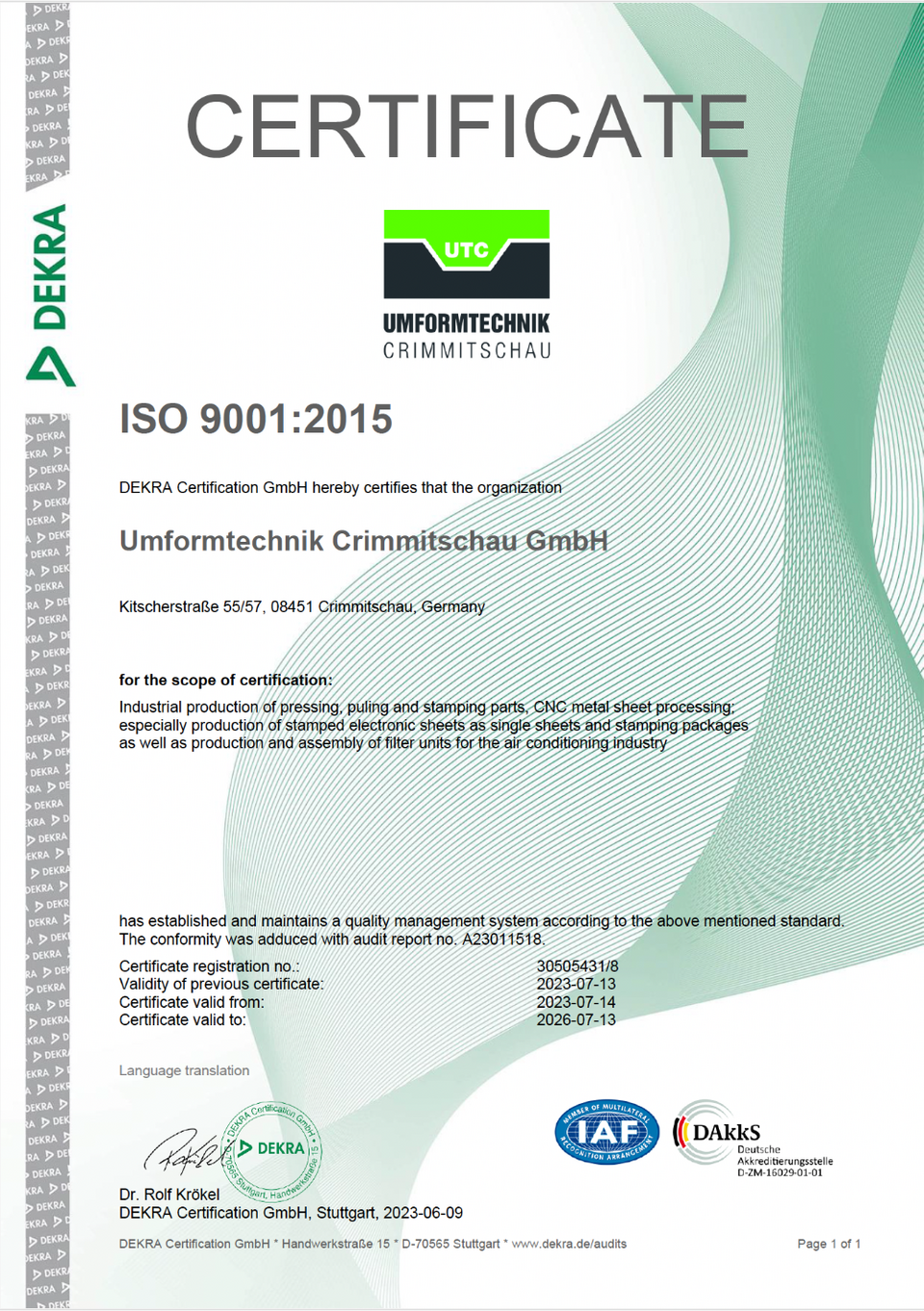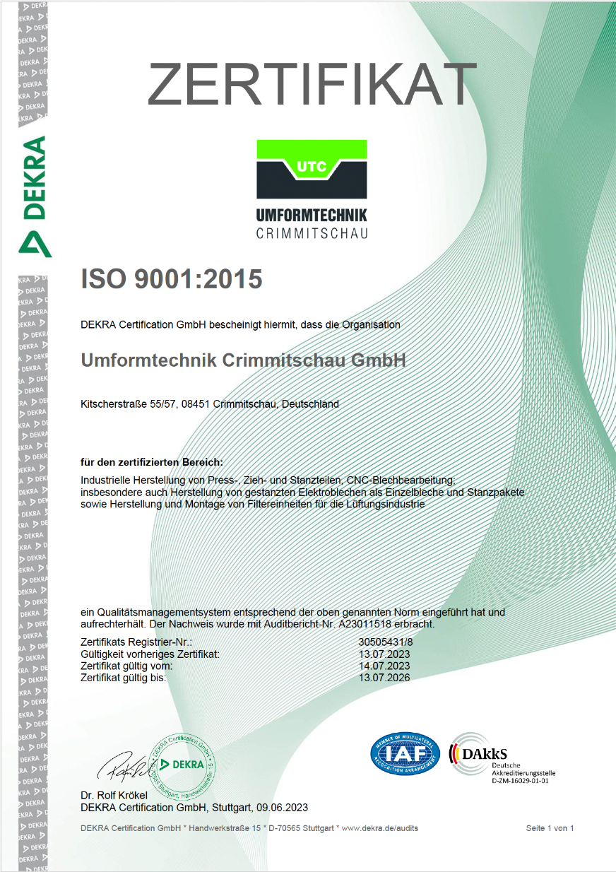 Derka Certification bescheinigt hiermit, dass das Unternehmen Umformtechnik Crimmitschau GmbH in den Bereichen Industrielle Herstellung von Press-, Zieh- und Stanzteilen, CNC-Blechbearbeitung; insbesondere auch Herstellung von gestanzten Elektroblechen als Einzelbleche und Stanzpakete sowie Herstellung und Montage von Filtereinheiten für die Lüftungsindustrie ein Qualitätsmanagementsystem entsprechend der oben genannten Norm (11/2015) eingeführt hat und dieses wirksam anwendet.