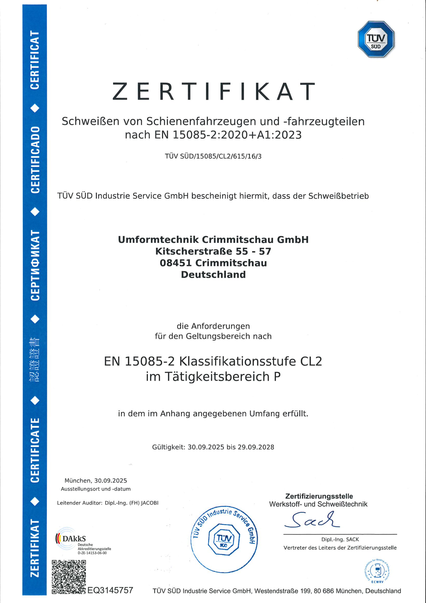 wir sind für das Schweißen von Schienenfahrzeugen und -fahrzeugteilen nach DIN EN 15085-2 zertifiziert.